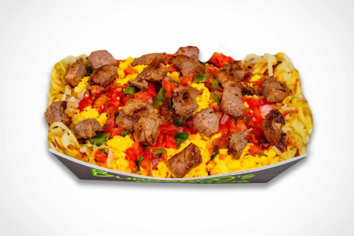 PHILLY STEAK SERVED WITH TWO (2) FRESH EGGS, HASHBROWNS, AMERICAN CHEESE AND FAJITA VEGGIES (SOME CUSTOMIZATION OFFERED) *SEASONED RICE AND ALL SALSAS CONTAIN CILANTRO*